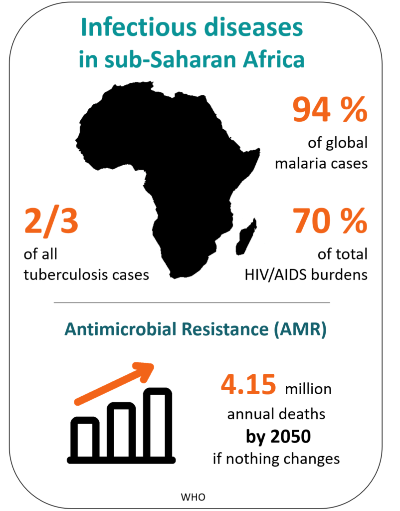 Sub-Saharan Africa is at the epicentre of the world’s most severe infectious diseases, bearing over 90% of global malaria cases, approximately 70% of the total HIV/AIDS burden, and two-thirds of all tuberculosis cases.